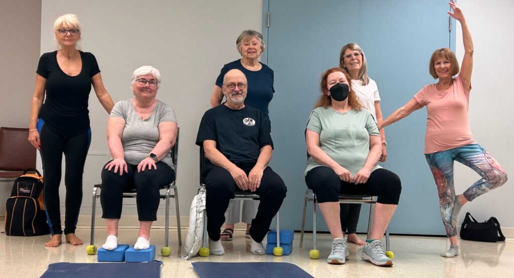 Pour ce cours, Karine Corbeil ajoute des notions de prévention des chutes, axées sur la mobilité des genoux, des pieds et des chevilles. « Ce qui permet de promouvoir l’autonomie à long terme à la maison ».