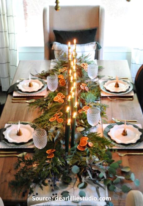 - Scandinave : des tons de bois naturel, du vert sauge, du blanc ou du crème, de la toile de jute ou du lin, et un centre de table de feuillages et tranches d’oranges séchées .