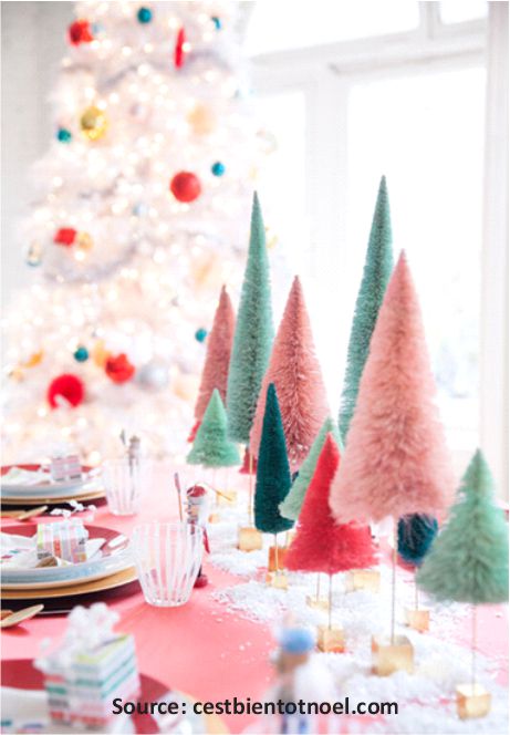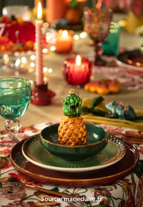 - Éclaté : pour ce style maximaliste, on exagère et on s’amuse avec une démesure de couleurs, d’accessoires, de paillettes et on dépose au centre de la table des guirlandes d’autrefois ou des boules de Noël dépareillées.