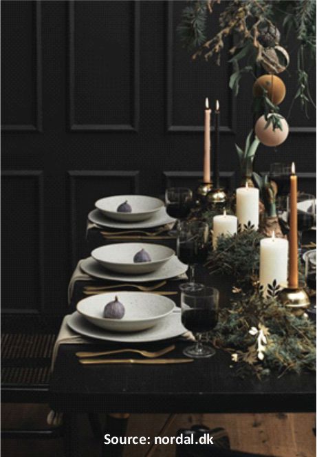 - Glamour : pensez grandes occasions : brillance, chandeliers en argent, dorures et contrastes forts tels que des assiettes blanches sur une nappe noire ou très foncée.