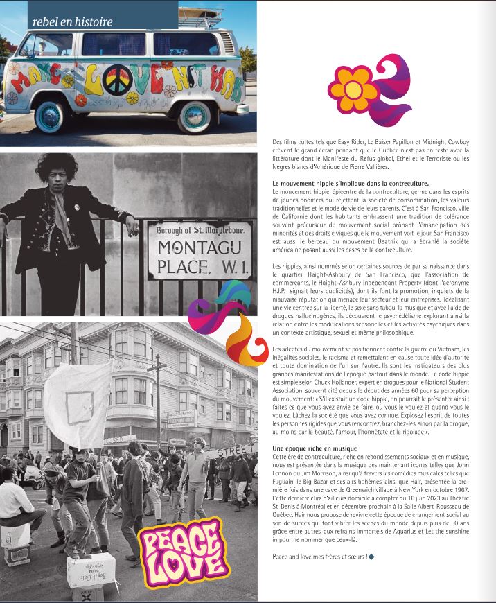 Cette ère de contreculture, riche en rebondissements sociaux et en musique, nous est présentée dans la musique des maintenant icones telles que John Lennon ou Jim Morrisson, ainsi qu’à travers les comédies musicales telles que Fugain, le Big Bazar et ses airs bohèmes, ainsi que Hair, présentée la première fois dans une cave de Greenwich village à New York en octobre 1967. Cette dernière élira d’ailleurs domicile à compter du 16 juin 2023 au Théâtre St-Denis à Montréal et en décembre prochain à la Salle Albert-Rousseau de QuébecHair nous propose de revivre cette époque de changement social au son de succès qui font vibrer les scènes du monde depuis plus de 50 ans grâce entre autres, aux refrains immortels de Aquarius et Let the sunshine in pour ne nommer que ceux-là. Mise en scène par Serge Denoncourt et inspirée par le flower power, la version québécoise de Hair risque de passer à l’histoire.