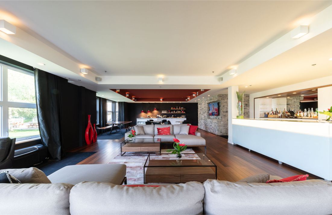 On retrouve, entre autres, une piscine accessible pendant trois saisons, un grand jacuzzi extérieur ouvert à l’année, un espace avec foyer pour prendre un verre ou jouer à des jeux de sociétés, des espaces quatre saisons avec feux et chaises Adirondak vue sur le lac, des dômes extérieurs qui permettent de commander un goûter accompagné de champagne Laurent-Perrier. Tout est propice à la détente et au divertissement.