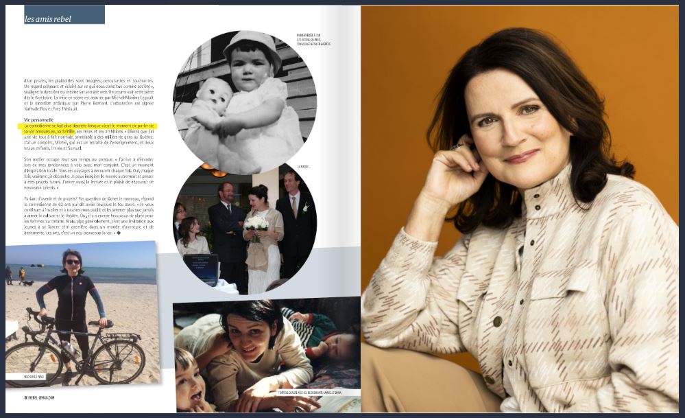 Parlant d’avenir et de projets? Pas question de lâcher le morceau, répond la comédienne de 63 ans qui dit avoir toujours le feu sacré. « Je veux continuer à inspirer et à toucher mon public et les amener plus que jamais à aimer la culture et le théâtre. Oui, il y a encore beaucoup de place pour les femmes au théâtre. Mais, plus généralement, c’est une invitation aux jeunes à se lancer tête première dans un monde d’aventure et de découverte. Les arts, c’est un peu beaucoup la vie. »