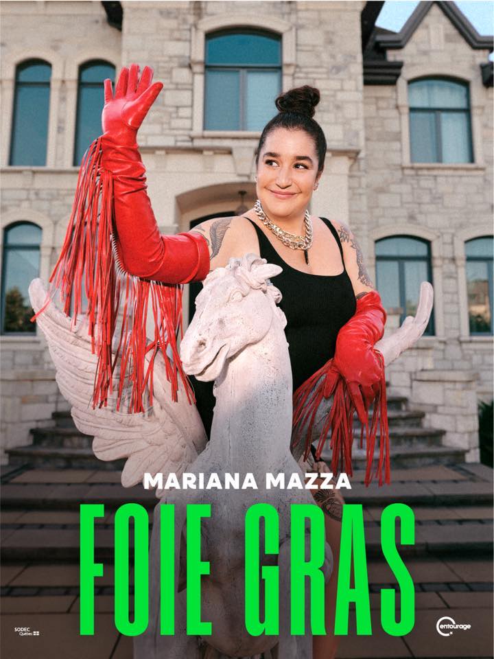 Pour son troisième spectacle, Foie Gras, Mariana Mazza décide de s’exprimer avec sa tête et son cœur… pour faire changement. Dans ce one-woman-show bien personnel, la jeune fille qui a grandi à Montréal-Nord, maintenant rendue une femme embourgeoisée qui vit à Saint-Lambert avec ses caniches et ses toiles invendues, se montre aussi brillante qu’hilarante. Étant habituée à dire des choses uniquement pour provoquer un rire, elle souhaite aller plus loin cette fois et faire un coming out au public : elle est émotive et vulnérable. Le chihuahua sur le Red Bull est officiellement remplacé par le tank au cœur de porcelaine. Comme elle le dit si bien : « C’est moi la meilleure tabarnak! » Oui, Mariana a changé. Mais à quel point?