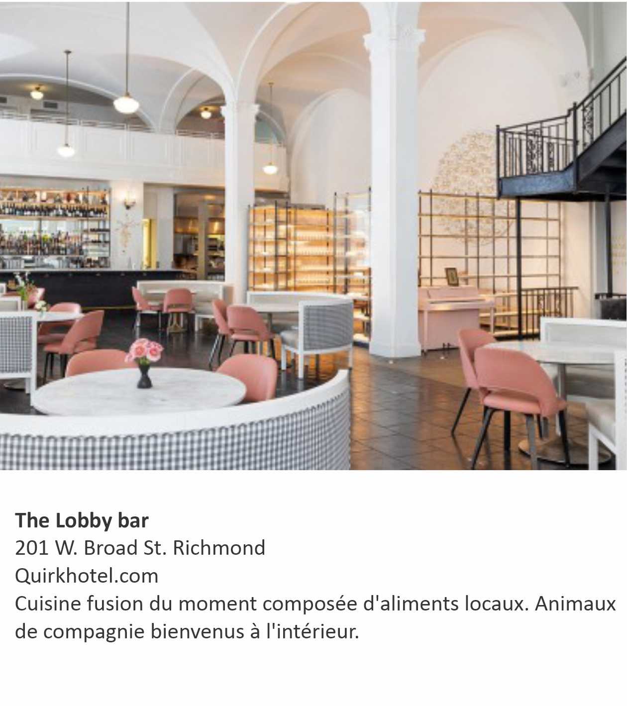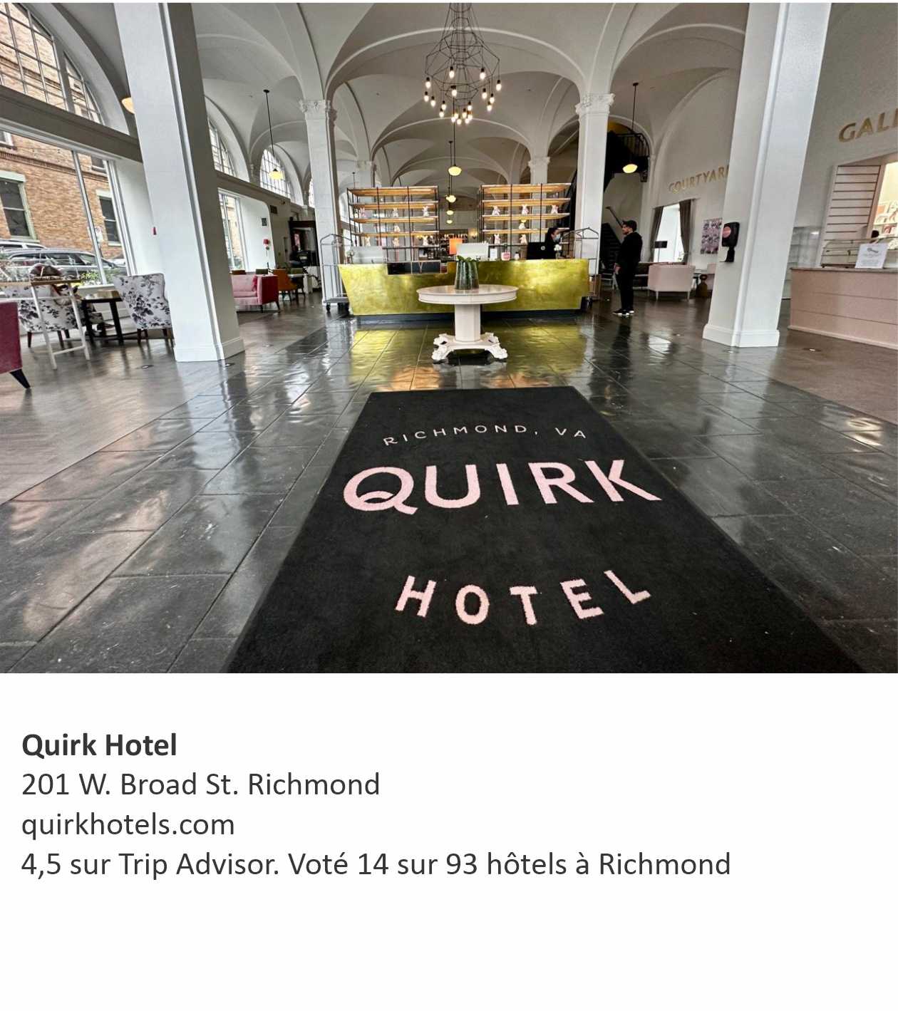Notre hôtel, le Quirk Hotel Richmond y va même d’une touche personnalisée en accueillant Charlot avec une affichette en forme d’os lui souhaitant la bienvenue. Oui, nous avons dû la traduire et lui lire. Mais quand même, quelle magnifique attention. D’ailleurs l’hôtel Quirk vaut le détour. Les proprios, Ted et Katie Ukrop ont rénové un bâtiment de huit étages construit en 1916 au style renaissance italienne qui aborde des arches architecturales au lobby et des plafonds de type cathédral d’une dizaine de mètres de hauteur. L’ensemble donne un cachet magnifique et un premier coup d’œil impressionnant.  Loin des hôtels aux décors conventionnels, le Quirk est tout en teinte rosée avec des fresques et œuvres d’art d’artistes locaux dans l’ensemble de l’hôtel. Vous ne trouverez pas de chambres identiques dans cet hôtel boutique qui ne compte que 73 chambres. Plafonds hauts, fenêtres magistrales et originaux au bâtiment, une beauté. De plus, Fido est le bienvenu au bar « Roof-Top » situé au 8e étage de l’édifice. Un excellent endroit pour relaxer avec une vue imprenable sur le quartier des arts.