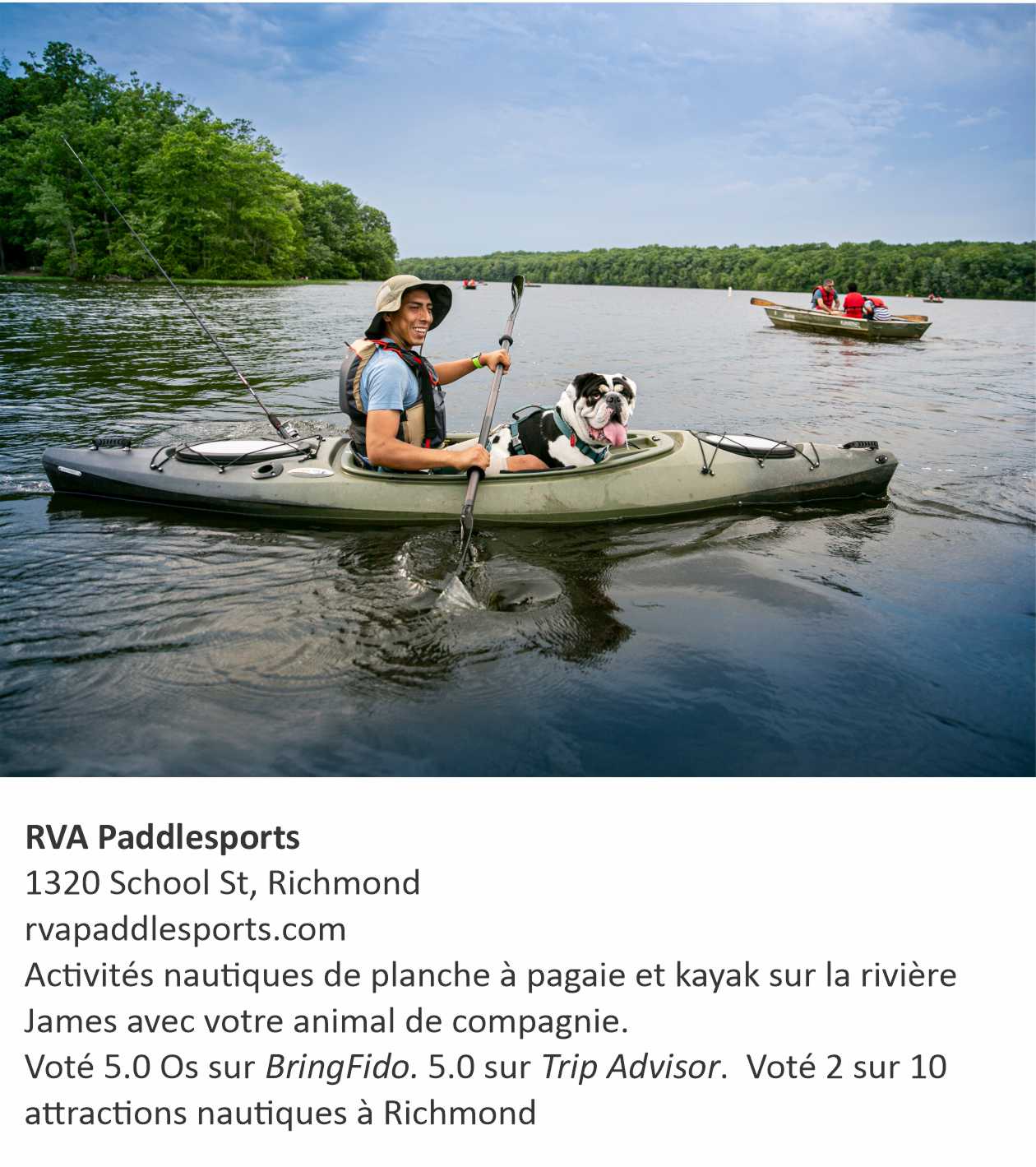 Votre animal peut vous accompagner dans une foule d’activités dont de la planche à pagaie ou du kayak sur la rivière James qui coupe la ville en deux. Il sera aussi bienvenu pour une randonnée dans tous les parcs et sentiers de la ville.