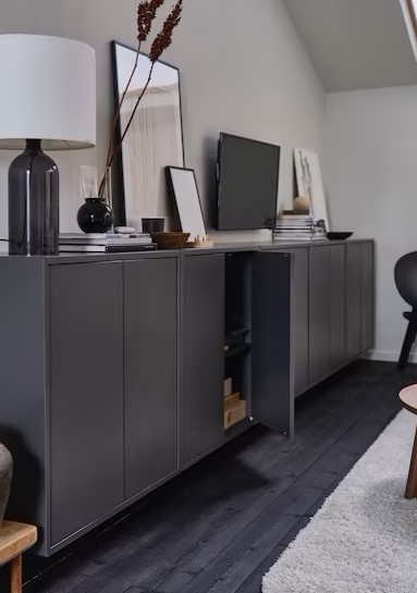• Des bibliothèques basses d’IKEA toutes simples mises bout à bout auxquelles vous pourrez ajouter des portes ou de jolies pattes donneront l’effet d’un super meuble fait sur mesure.